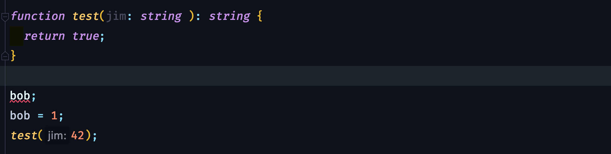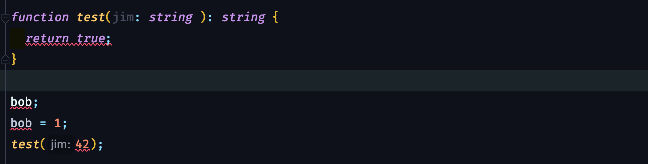 我将test()函数的返回类型定义为string,但返回boolean,而不是抛出错误。然而,当我随机地写入一个未声明的变量时,它会抛出错误,它说期望赋值应该是未声明的变量。在它下面,我只调用测试函数,就像所以test(),只是看看它在调用函数时是否抛出了正确的错误;没有骰子。