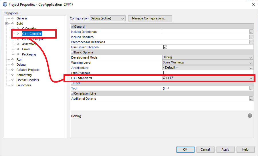 如果选择{project} > Properties > Build > C++ Compiler,则可以验证是否使用了C++17标准: