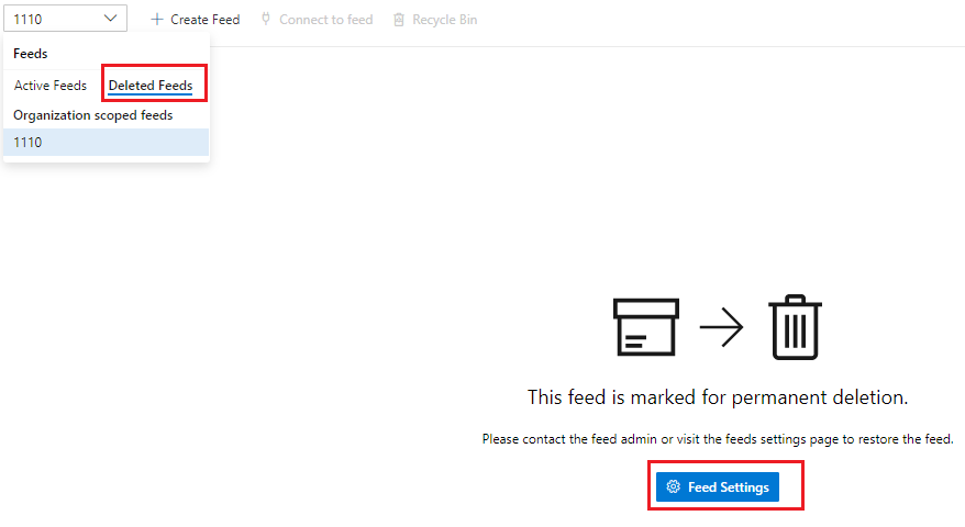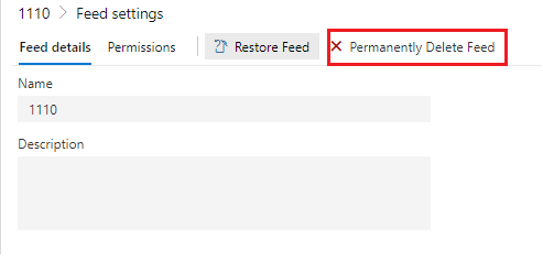 一旦删除,提要将进入禁用状态30天后,它将被永久删除。在这种状态下,包无法安装、发布或操作,存储将无法回收。您可以将提要还原到它的原始状态,或者在提要设置中永久删除它以清理存储。在永久删除之前,不能重用此提要名称。