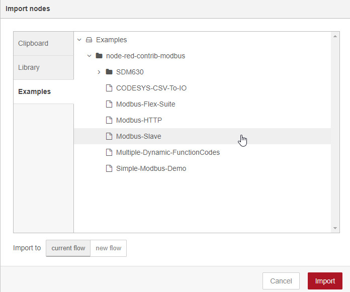 了解如何使用Modbus Server的最佳方法是查看演示流。要从主节点红色菜单中选择“导入”并选择Examples->nod-red-contrib-modbus->Modbus-Slave: