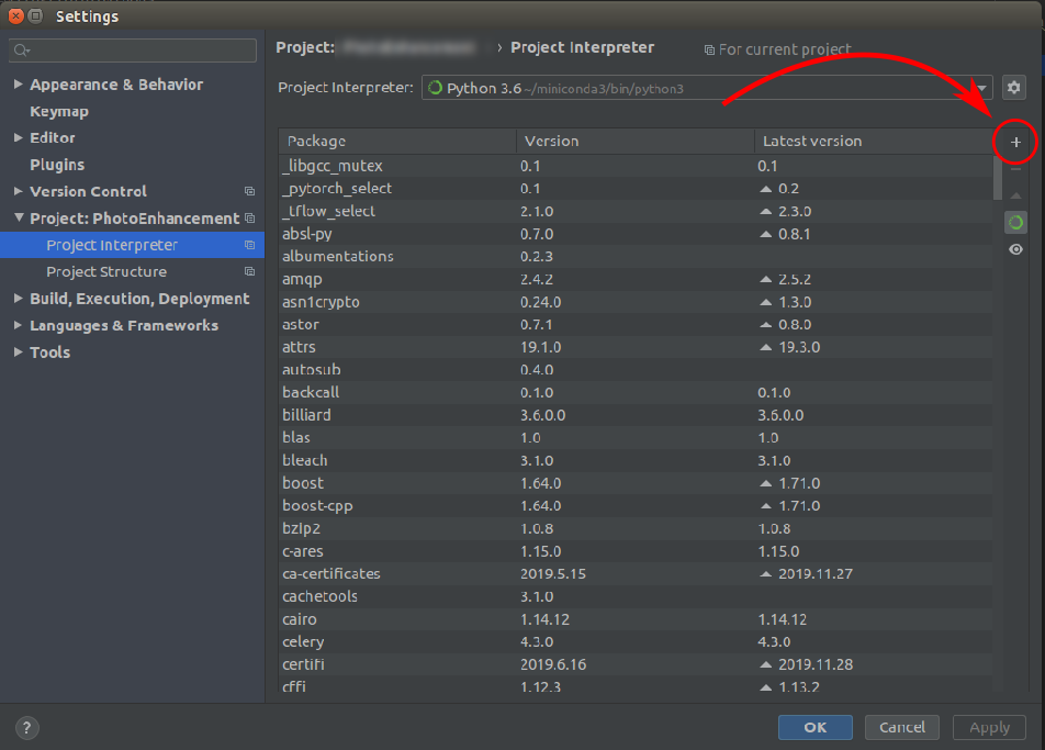 虽然您可以直接在PyCharm中安装软件包,方法是转到file->settings,选择Project Interpreter并单击右上角的“+”图标(见图)