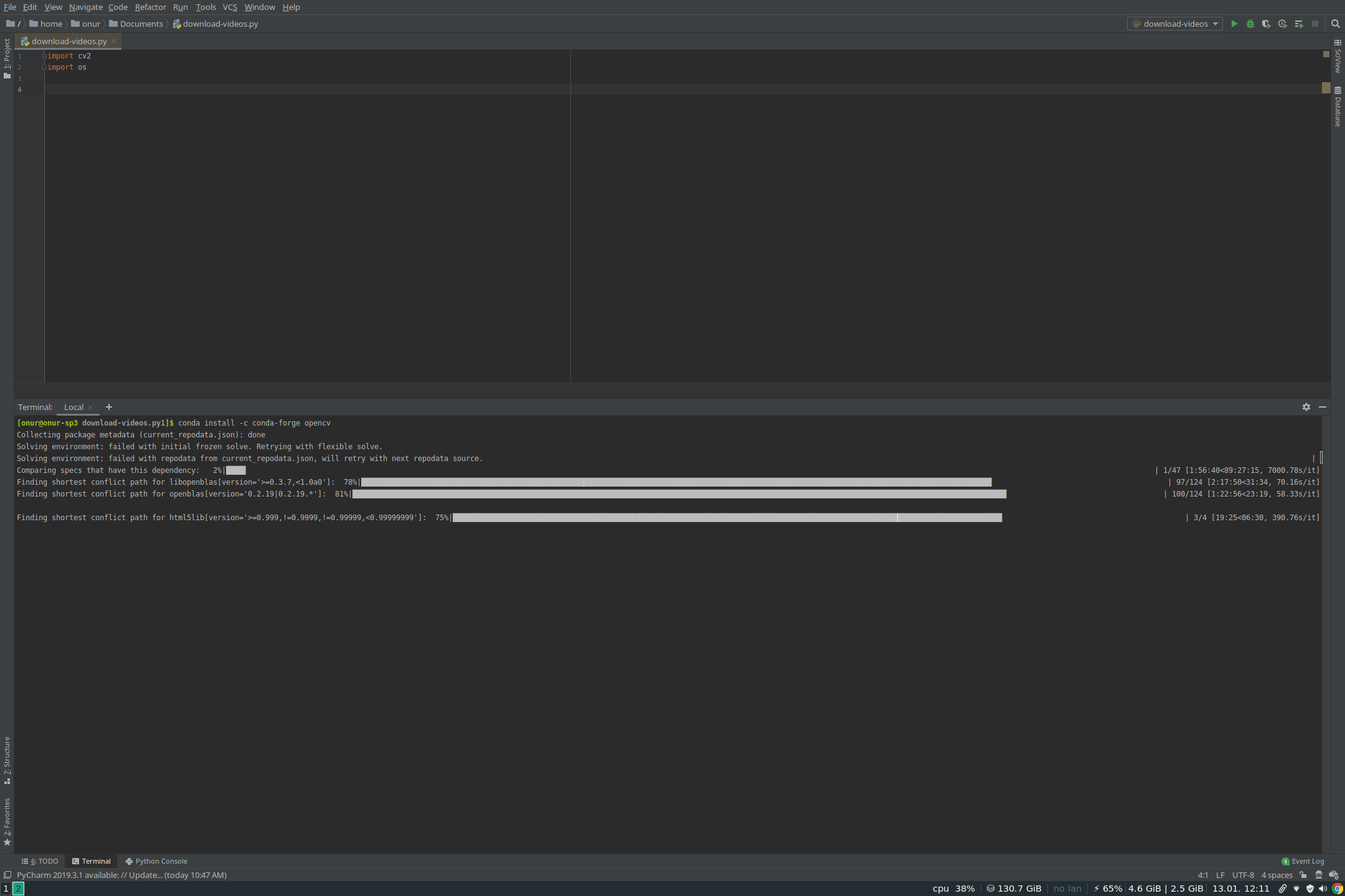 如果这是一个堆叠溢出-适当的帖子,所以请原谅这个问题是错误的。我试图通过conda虚拟环境将OpenCV安装到我的Pycharm中。我在PyCharm终端中输入了PyCharm,它已经这样做了11个小时,天知道还有多少。