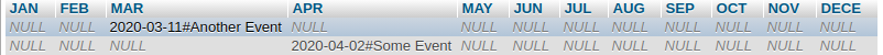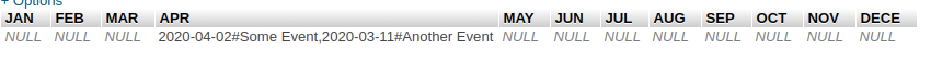 我想要检索1行,列为一月至十二月,数据作为每个月的所有假期。我试过