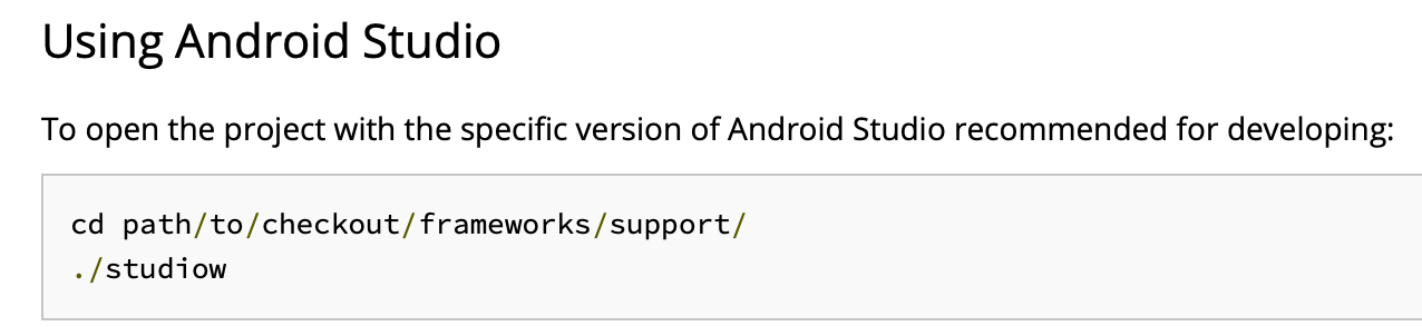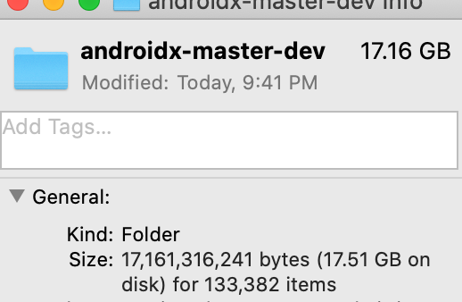 注意事项:确保至少有20 GB可用。我预计它在6GB左右(正如说明中提到的-“现在,您的存储库被设置为只提取构建和运行AndroidX库所需的内容。下载代码(在我们降低6GB时喝杯咖啡”)-结果是一个高达17 GB的;