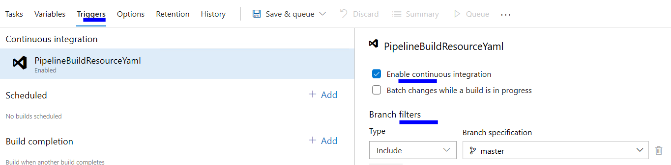 以支持持续的集成。您需要转到触发器选项卡并检查启用持续集成(通过启用CI,在提交对回购的更改时将触发管道)