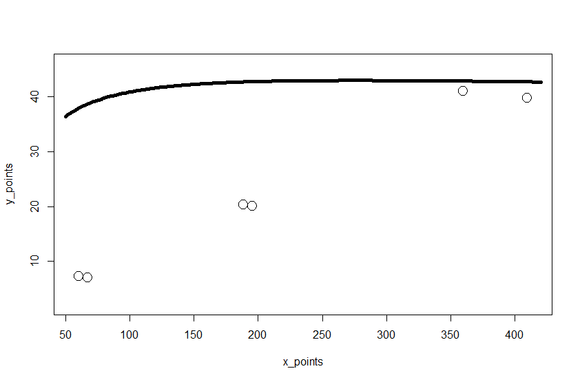 一般来说,你很难用6点来估计4个参数。如果你有很好的数据符合你的模型,nlm将收敛。在您的情况下,要么您的数据是错误的,要么您的公式规格偏差是巨大的。