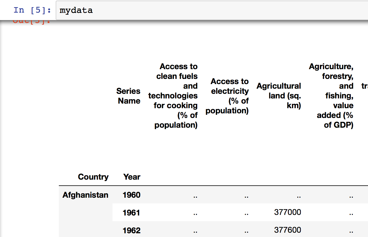 它用于代码'mydata = mydata.pivot(index='Country‘、'Year’、columns='Series Name‘、Value=’Value‘)’错误消息: