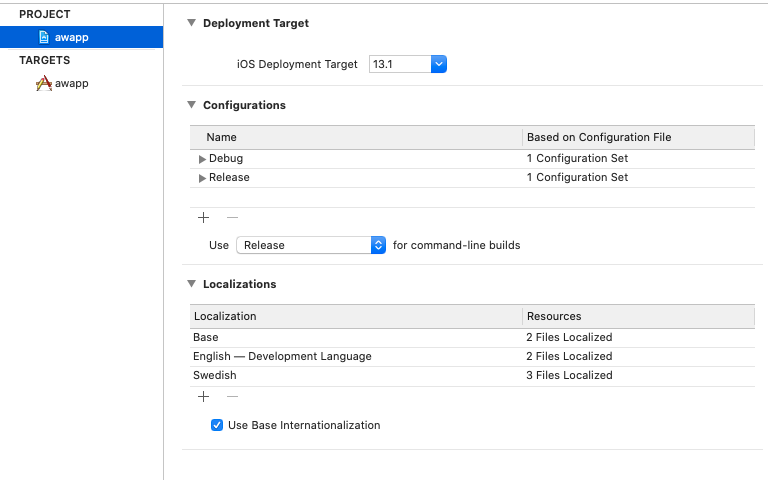 为此,我检查了“使用基本国际化”的项目设置,但是基本不在列表中,它应该是在我的项目中创建Base.lproj文件夹,但它也不在那里。