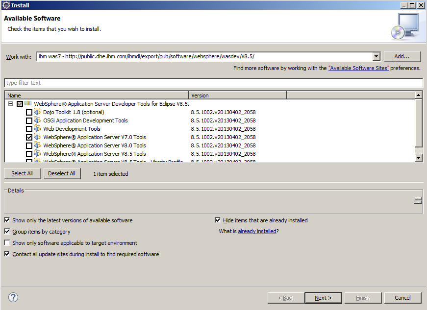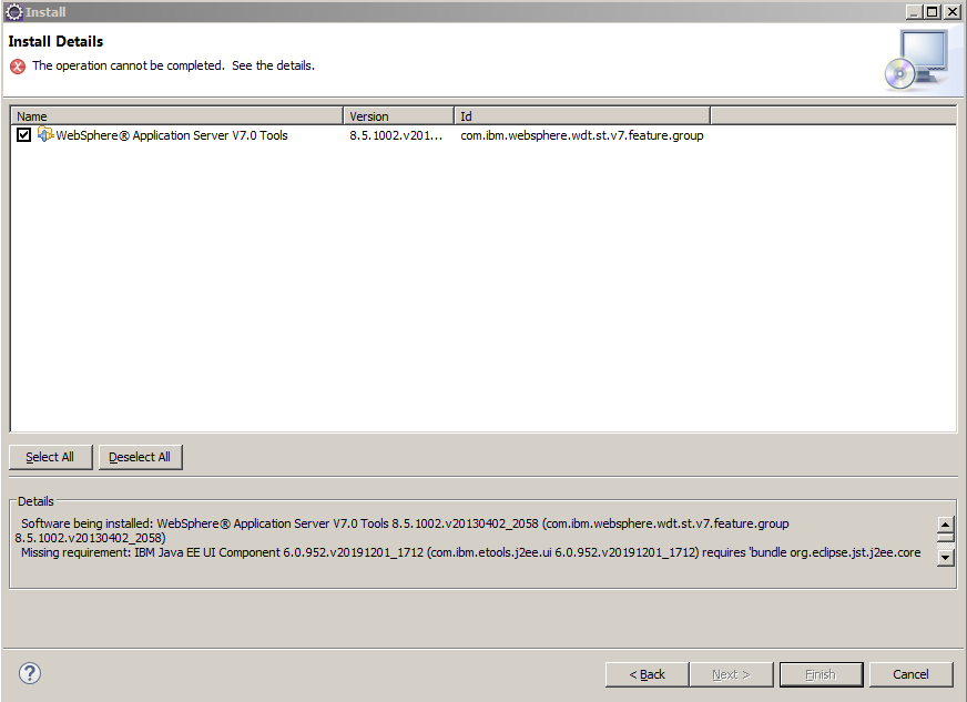 我们能够到达一个软件站点,它允许我们选择用于安装的WAS7开发工具,但是当推进插件安装过程时,我们会遇到一个致命的错误。