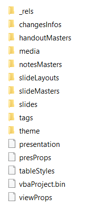 EDIT2如果您将powerpoint从.pptm重命名为.zip```, you can see a folder inside the Zip file called ```ppt。在里面,你可以得到以下文件夹: