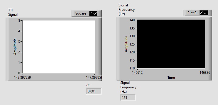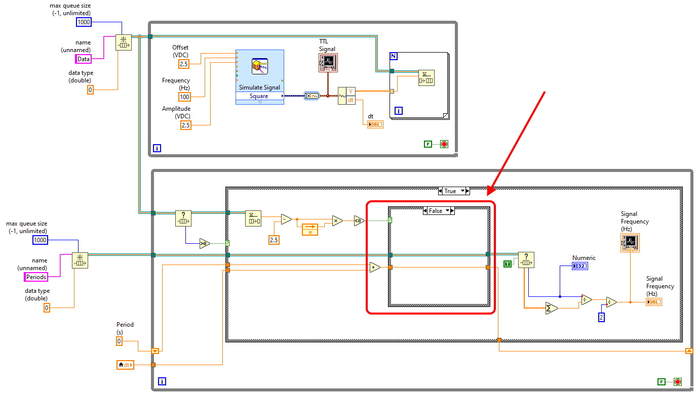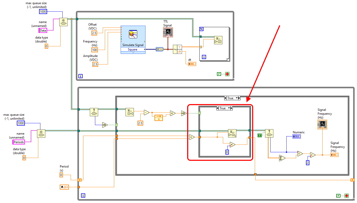 注意: One可以使用Express >>信号分析系统(Express >> Signal Analysis >> Timing and Transitions VI )来测量频率,但由于某种原因,它对我不起作用,更重要的是,我想学习如何自己编写程序。
