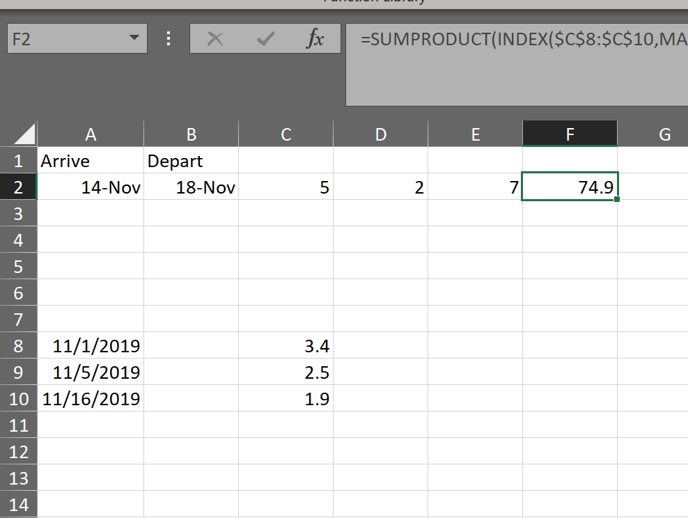 =SUMPRODUCT(INDEX($C$8:$C$10,MATCH(ROW(INDEX($ZZ:$ZZ,A2):INDEX($ZZ:$ZZ,B2)),$A$8:$A$10)))*E2这是一个数组公式,在退出编辑模式时需要使用Ctrl Enter而不是Enter。
