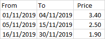 {=INDEX(Pricing!$C:$C,MATCH(1,(Pricing!$A:$A<=IF(ISTEXT($A2),DATEVALUE($A2),$A2))*(Pricing!$B:$B>=IF(ISTEXT($A2),DATEVALUE($A2),$A2)),0))}发布于 2019-12-06 15:35:47