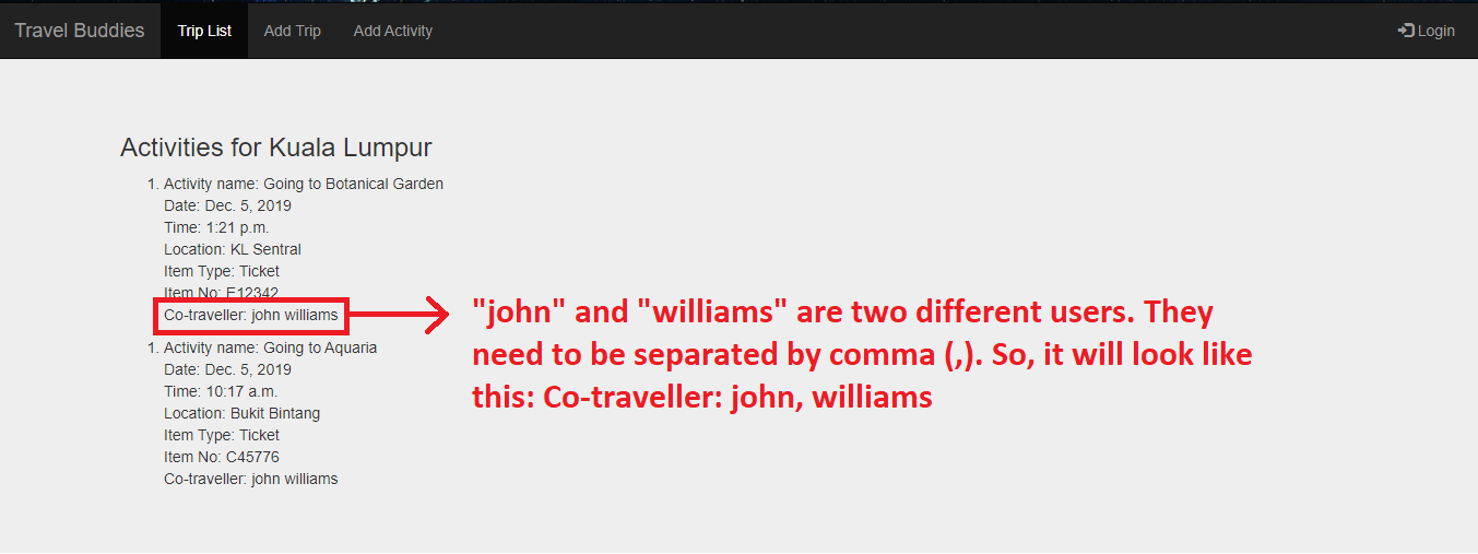 "john“和"williams”是两个独立的用户名。它们需要用逗号(,)分隔。所以看起来是这样的:Co-traveller: john, williams。我该怎么做呢?
