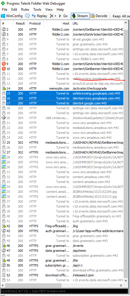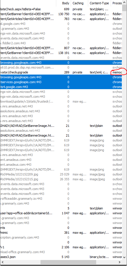 不过,上述所有与谷歌相关的项目都属于"Chrome“程序。它们都不属于"MemoQ“过程。属于"MemoQ“流程的唯一项目是屏幕截图中突出显示的项,这是对更新的请求。