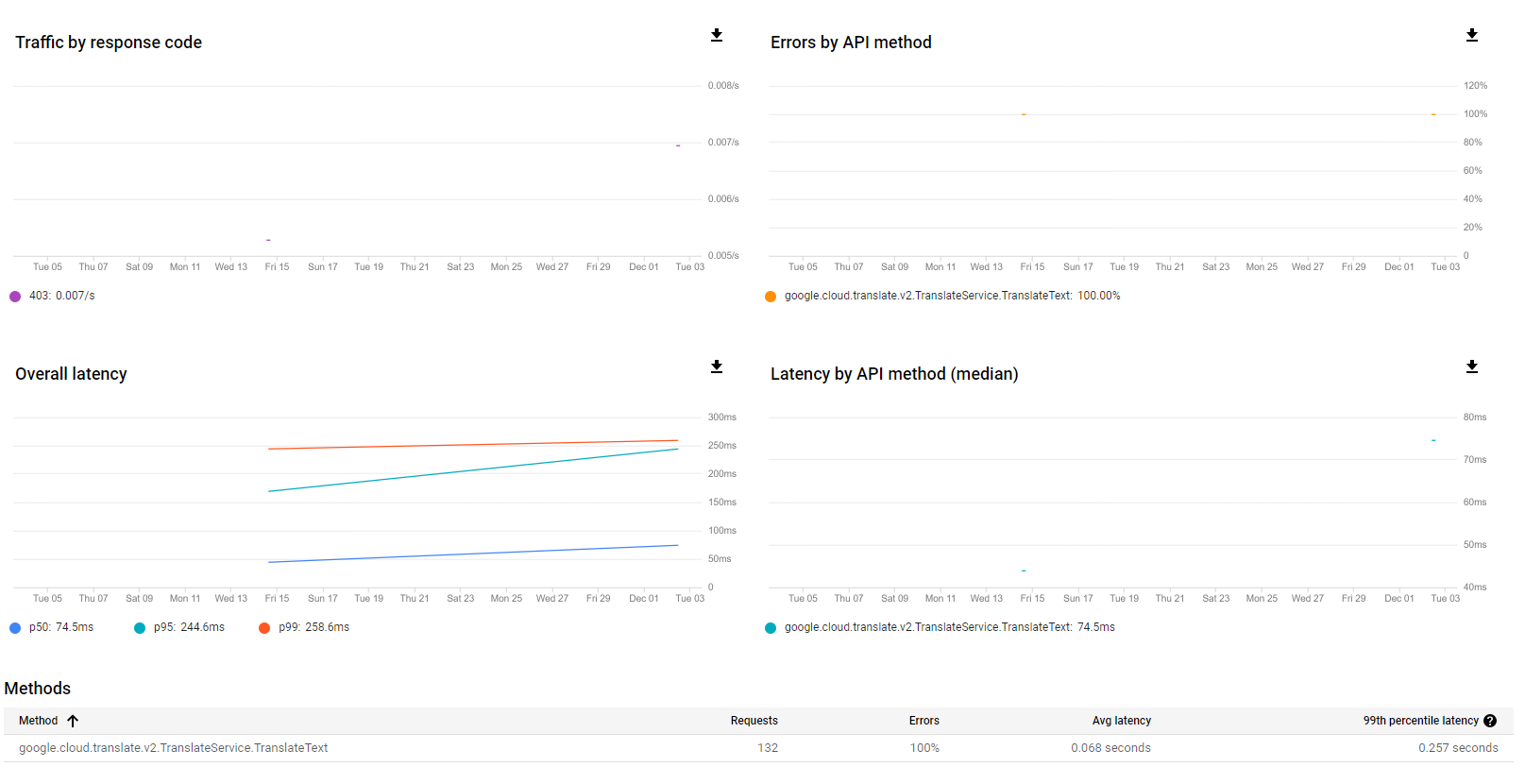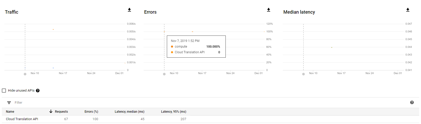 在Google控制台,我可以看到API使用的历史,我看到来自MemoQ的请求正在进入Google,但是错误率是100%。