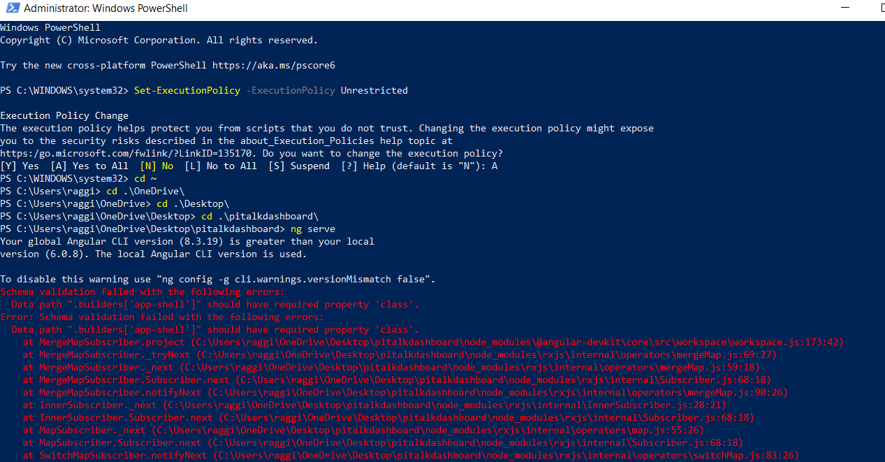 在PowerShell -ExecutionPolicy Unrestricted上运行之后,没有什么改变。但出现了一个错误。Data path ".builders['app-shell']" should have required property 'class'.见下面的打印屏幕