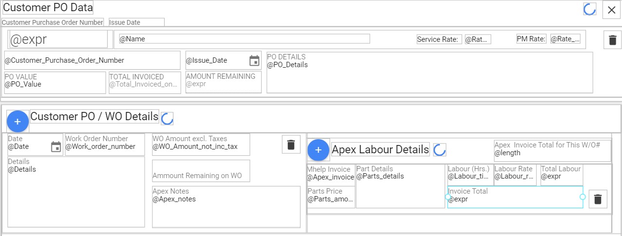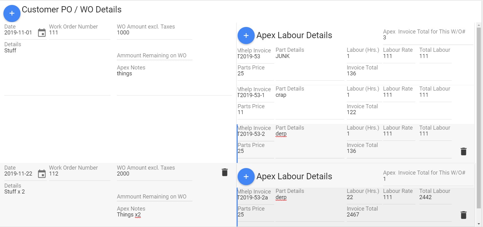 Apex_customer_po_wo_costing --我们在这里记录我们做了什么工作,以及每个工作订单中我们使用了多少钱。这些字段包括参考编号(字符串)、零件价格(编号)、部件详细信息(字符串)、劳动小时(编号)、劳动率(编号)、总劳动(编号)和发票总数(编号),工作订单所有发票的总总数(编号)。