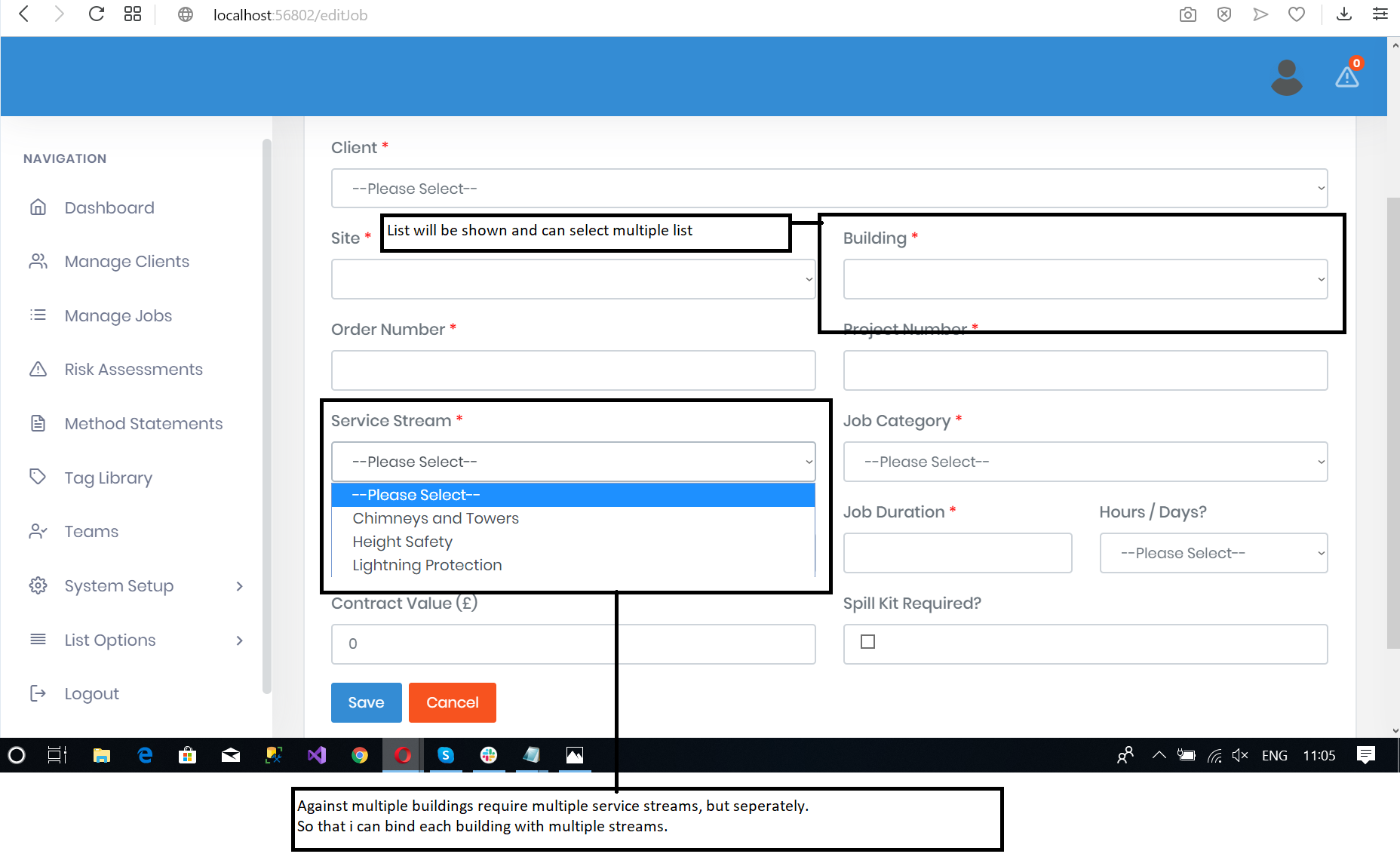 根据图片,有一个建筑物下拉,但我将更改为列表框,当选择多个建筑物需要多个服务流的选择,每个建筑物应该有唯一的服务流。因为我不能多次发帖来创建一个有流的建筑。