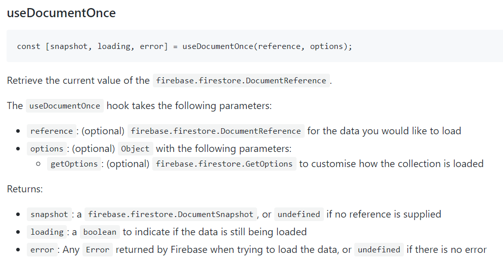 此外,我还查看了react firebase-hooks,这里是useDocumentOnce的文档: