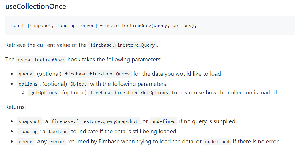 请参阅useCollection和useDocumentOnce的文档(它们非常相似):