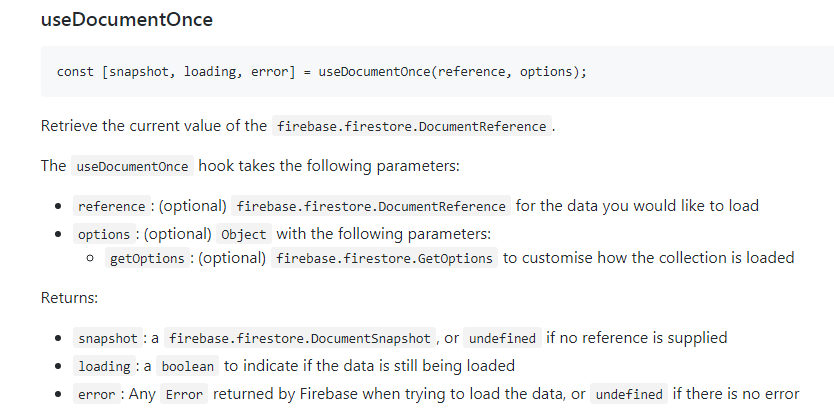 此外,我还查看了react firebase-hooks,这里是useDocumentOnce的文档: