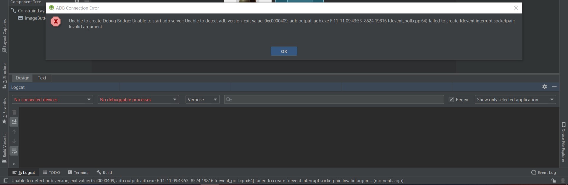 无法检测adb版本,退出值: 0xc0000409,adb输出: adb.exe f 11-11 09:55:06 17768 944 fdevent_poll.cpp:64]无法创建fdevent中断套接字对:无效参数