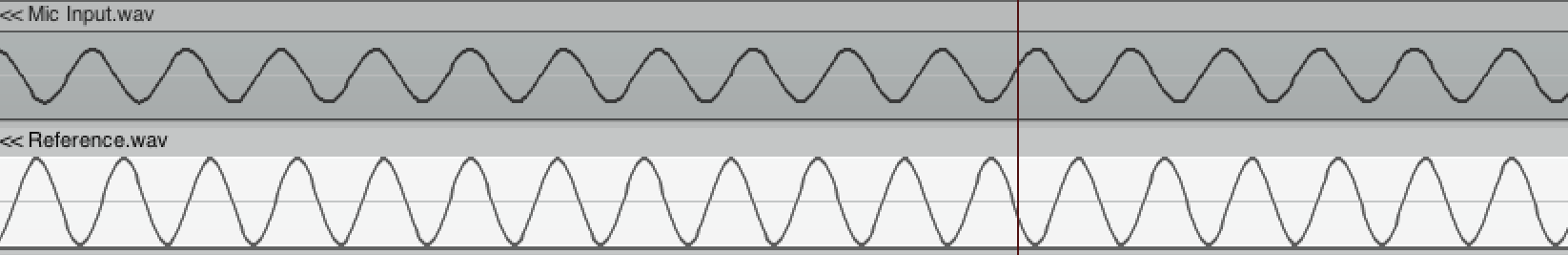 }如果我运行这个应用程序,控制台将打印出两个创建的wavs的url (一个是生成的正弦波,另一个是记录的麦克风输入)。如果我在daw中检查这些,我会得到以下信息。你可以看到这两个正弦波不同步。这使我相信样本率是不同的,但是输出到控制台的格式显示它们并没有不同。
