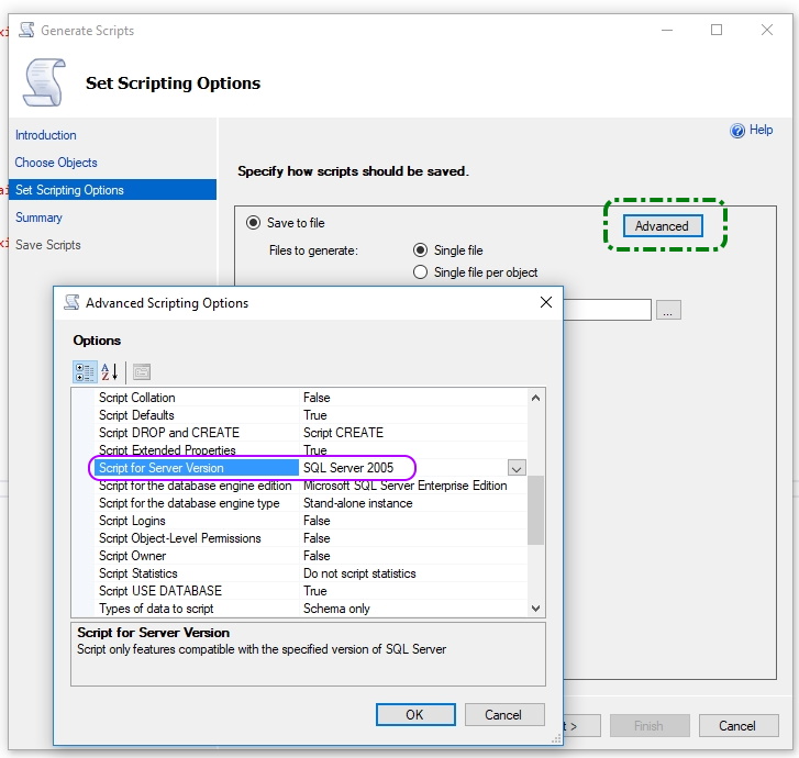 在SSMS中运行"Generate“任务时,可以定义要为以下目的创建脚本的服务器版本: