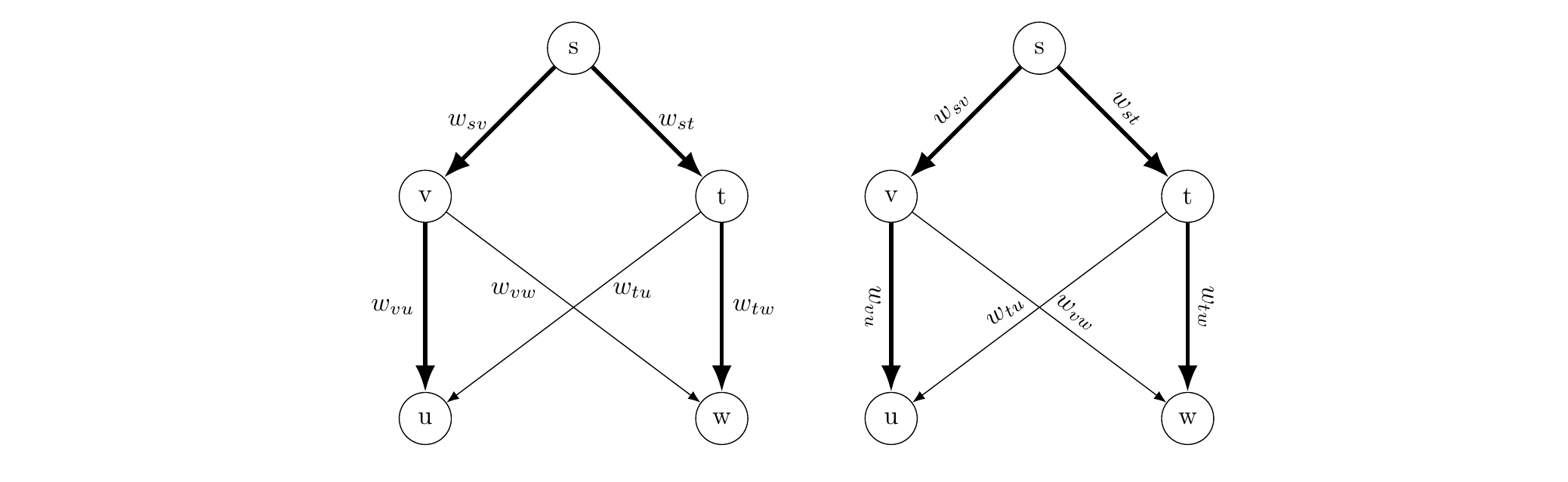 \draw[edge] (t) to node[above, xshift=8mm] {$w_{tu}$} (u);