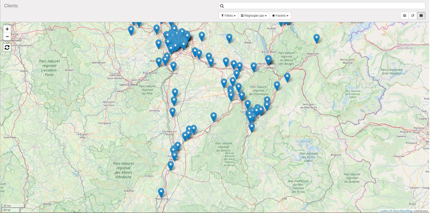 我在Odoo做了一个定制视图,将合作伙伴(来自res_partner)放置在地图上(通过传单)。在这张地图上,它用一个弹出的标记来显示与合作伙伴相关的信息。(就像这张照片)