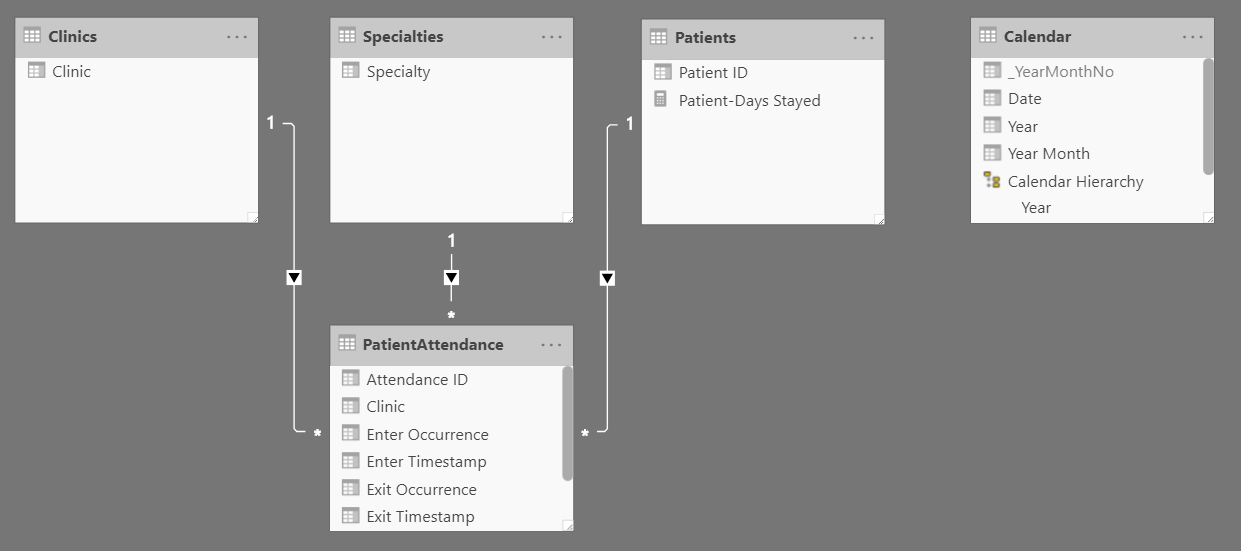 我创建了一个数据模型,这是一个星型模式,由上面所示的一个事实表PatientAttendance和三维表Clinics、Specialties和Patients组成。此外,我们还有Calendar维度表,它与其他表没有任何物理关系,而是用于度量计算和切片。