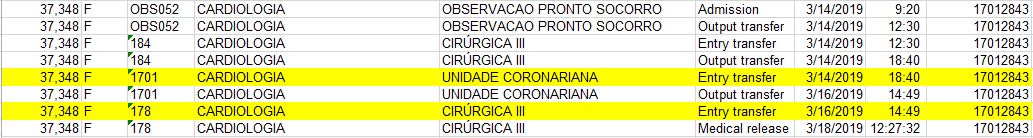 在这个转换的表中,每一行代表一个病人到临床部门就诊。病人可因“入院”或“进入转移”而进入临床部门,并可因“输出转移”、“医疗释放”或“死亡”而退出该部门。每一行都有两个时间戳;当病人进入,退出时,部门。