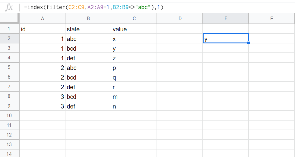 =index(filter(C2:C9,A2:A9=1,B2:B9<>"abc"),1)