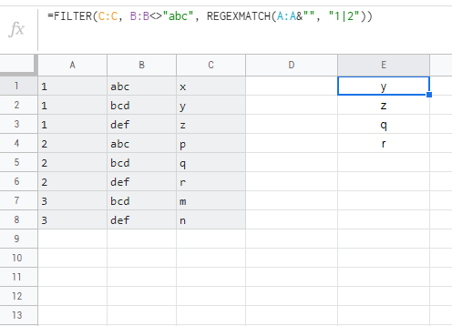 =FILTER(C:C, B:B<>"abc", REGEXMATCH(A:A&"", "1|2"))