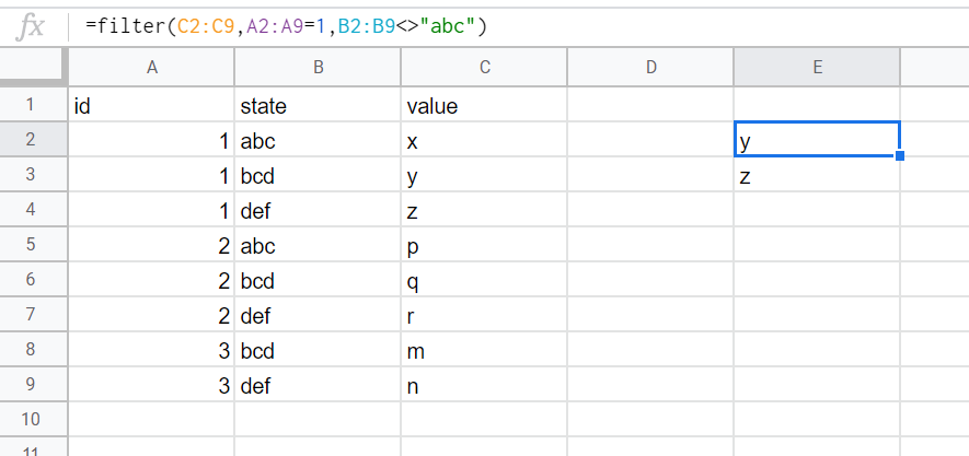 filter(C2:C9,A2:A9=1,B2:B9<>"abc")
