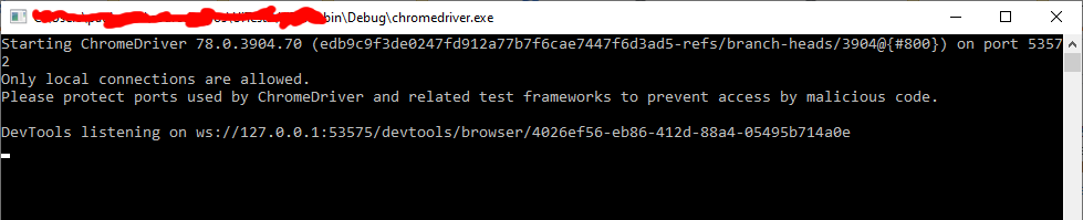 Starting ChromeDriver 78.0.3904.70 (edb9c9f3de0247fd912a77b7f6cae7447f6d3ad5-refs/branch-heads/3904@{#800}) on port 53677