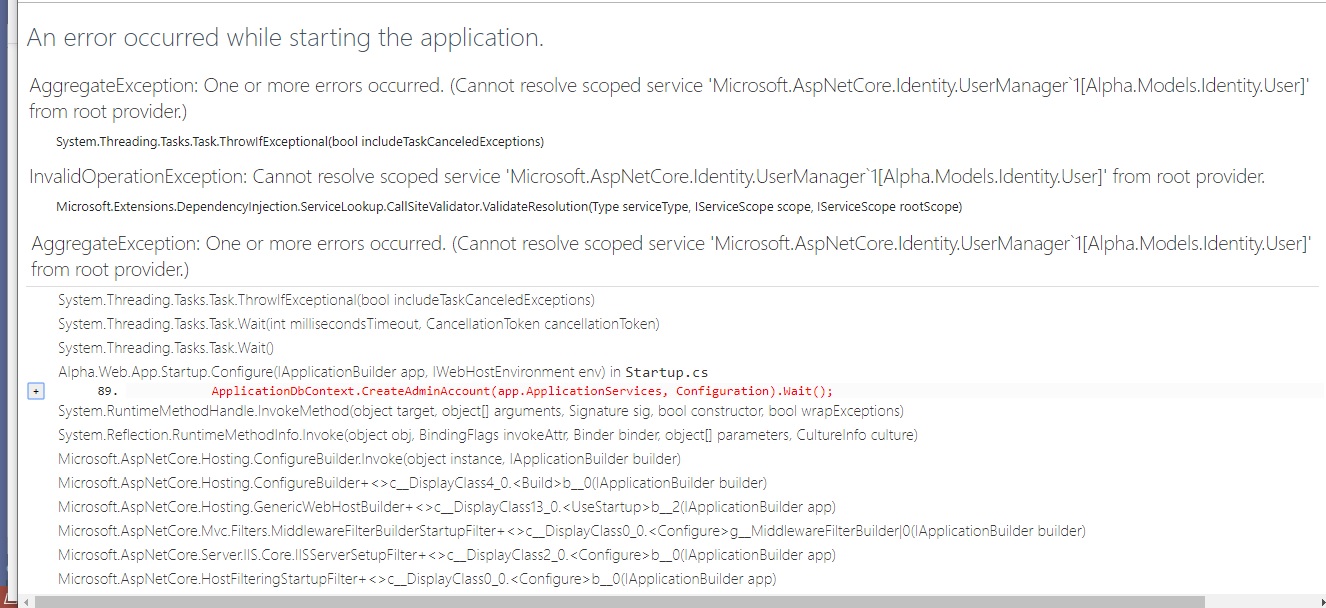 AggregateException:发生了一个或多个错误。(无法从根提供程序解析作用域服务'Microsoft.AspNetCore.Identity.UserManager1[Alpha.Models.Identity.User]' from root provider.) System.Threading.Tasks.Task.ThrowIfExceptional(bool includeTaskCanceledExceptions) System.Threading.Tasks.Task.Wait(int millisecondsTimeout, CancellationToken cancellationToken) System.Threading.Tasks.Task.Wait() Alpha.Web.App.Startup.Configure(IApplicationBuilder app, IWebHostEnvironment env) in Startup.cs + ApplicationDbContext.CreateAdminAccount(app.ApplicationServices, Configuration).Wait(); System.RuntimeMethodHandle.InvokeMethod(object target, object[] arguments, Signature sig, bool constructor, bool wrapExceptions) System.Reflection.RuntimeMethodInfo.Invoke(object obj, BindingFlags invokeAttr, Binder binder, object[] parameters, CultureInfo culture) Microsoft.AspNetCore.Hosting.ConfigureBuilder.Invoke(object instance, IApplicationBuilder builder) Microsoft.AspNetCore.Hosting.ConfigureBuilder+<>c\_\_DisplayClass4\_0.b\_\_0(IApplicationBuilder builder) Microsoft.AspNetCore.Hosting.GenericWebHostBuilder+<>c\_\_DisplayClass13\_0.b\_\_2(IApplicationBuilder app) Microsoft.AspNetCore.Mvc.Filters.MiddlewareFilterBuilderStartupFilter+<>c\_\_DisplayClass0\_0.g\_\_MiddlewareFilterBuilder|0(IApplicationBuilder builder) Microsoft.AspNetCore.Server.IIS.Core.IISServerSetupFilter+<>c\_\_DisplayClass2\_0.b\_\_0(IApplicationBuilder app) Microsoft.AspNetCore.HostFilteringStartupFilter+<>c\_\_DisplayClass0\_0.b\_\_0(IApplicationBuilder app) Microsoft.AspNetCore.Hosting.GenericWebHostService.StartAsync(CancellationToken cancellationToken) Microsoft.Extensions.Hosting.Internal.Host.StartAsync(CancellationToken cancellationToken) Microsoft.Extensions.Hosting.HostingAbstractionsHostExtensions.RunAsync(IHost host, CancellationToken token) Microsoft.Extensions.Hosting.HostingAbstractionsHostExtensions.RunAsync(IHost host, CancellationToken token) Microsoft.Extensions.Hosting.HostingAbstractionsHostExtensions.Run(IHost host) Alpha.Web.App.Program.Main(string[] args) in Program.cs + CreateHostBuilder(args).Build().Run(); Show raw exception details InvalidOperationException: Cannot resolve scoped service 'Microsoft.AspNetCore.Identity.UserManager1Alpha.Models.Identity.User‘。Microsoft.Extensions.DependencyInjection.ServiceLookup.CallSiteValidator.ValidateResolution(Type serviceType,IServiceScope scope,IServiceScope rootScope) Microsoft.Extensions.DependencyInjection.ServiceProvider.Microsoft.Extensions.DependencyInjection.ServiceLookup.IServiceProviderEngineCallback.OnResolve(Type serviceType,IServiceScope scope) Microsoft.Extensions.DependencyInjection.ServiceLookup.ServiceProviderEngine.GetService(Type serviceType,ServiceProviderEngineScope serviceProviderEngineScope) Microsoft.Extensions.DependencyInjection.ServiceLookup.ServiceProviderEngineScope.GetService(Type serviceType) Microsoft.Extensions.DependencyInjection.ServiceProviderServiceExtensions.GetRequiredService(IServiceProvider提供者,Microsoft.Extensions.DependencyInjection.ServiceProviderServiceExtensions.GetRequiredService(IServiceProvider提供者( Alpha.DataAccess.ApplicationDbContext.CreateAdminAccount(IServiceProvider serviceProvider,IConfiguration configuration)在ApplicationDbContext.cs + UserManager userManager =serviceProvider.GetRequiredService>()中输入;