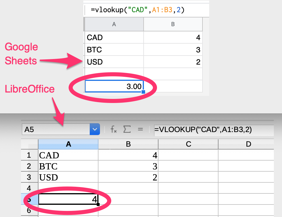 按预期返回4,Sheets.=vlookup("CAD",A1:B3,2)