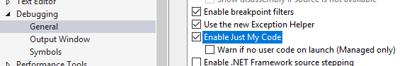 就像@stuartd在上面的注释中说的那样,为调试选项“只启用我的代码”启用(复选框):