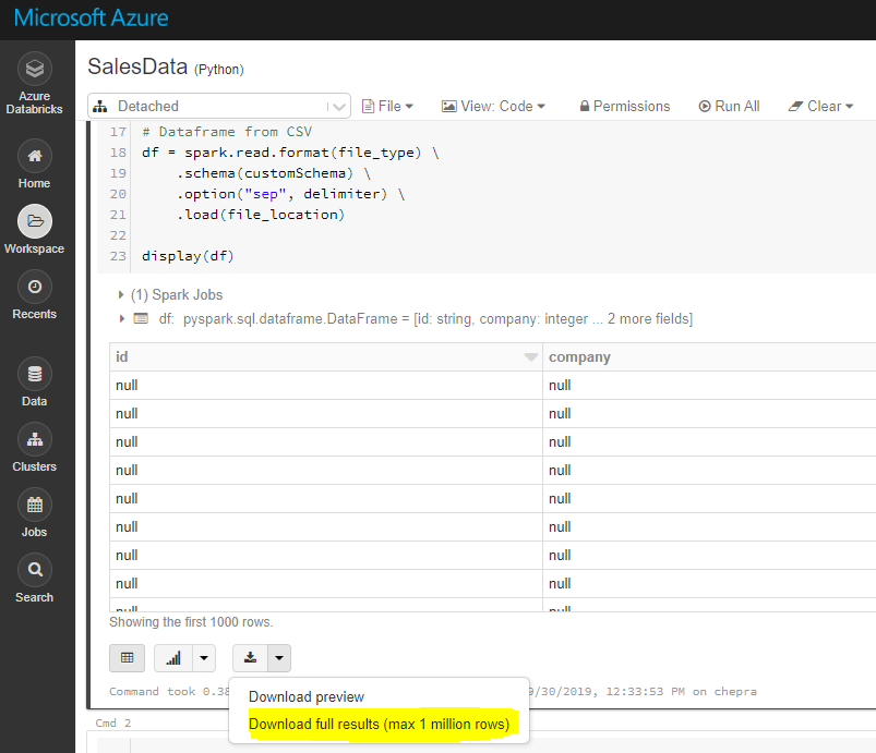 要下载完整的结果,首先将文件保存到dbfs,然后使用Databricks cli将文件复制到本地机器,如下所示。