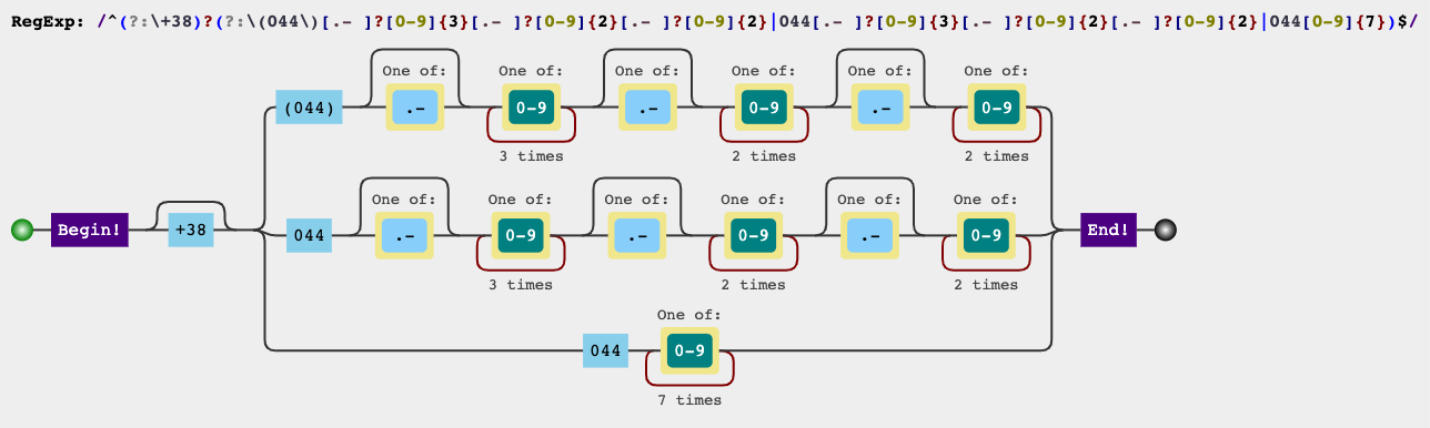 ^(?:\+38)?(?:\(044\)[ .-]?[0-9]{3}[ .-]?[0-9]{2}[ .-]?[0-9]{2}|044[ .-]?[0-9]{3}[ .-]?[0-9]{2}[ .-]?[0-9]{2}|044[0-9]{7})$或者更严格的限制,如果我们能确认。