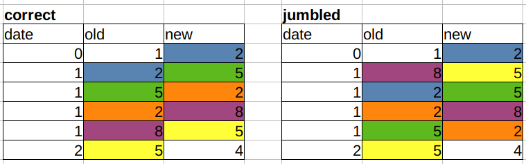 ### jumbled: the `new` value of a row is not the same as the next row's `old` value