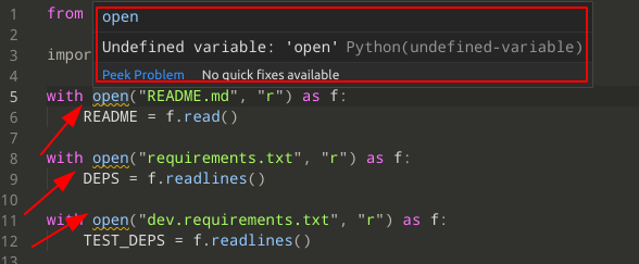 我选择了flake8作为我在VSCode上的项目,该项目将它安装到了虚拟环境中。它抱怨许多内置的函数,比如open。