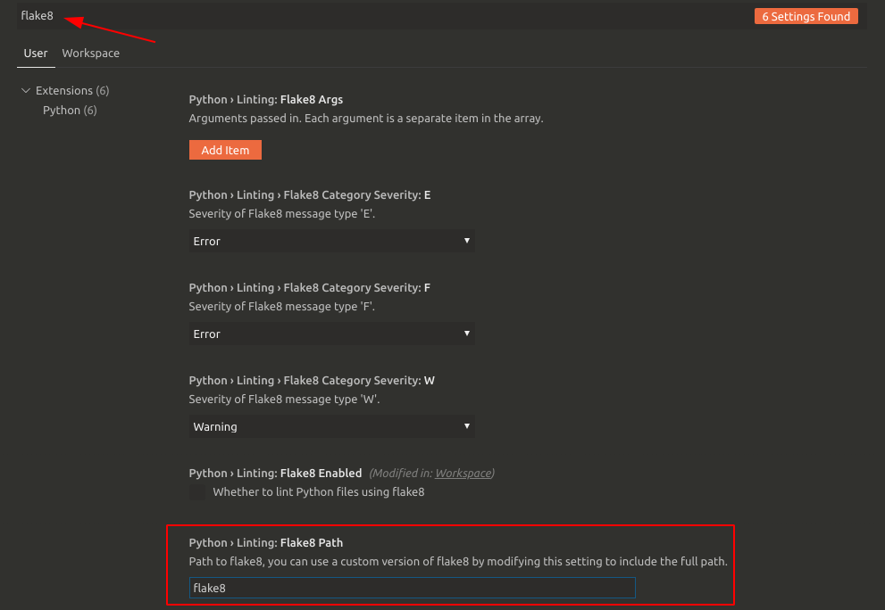 我们对"Flake8路径“设置感兴趣,它默认为"flake8”值,如屏幕快照所示。