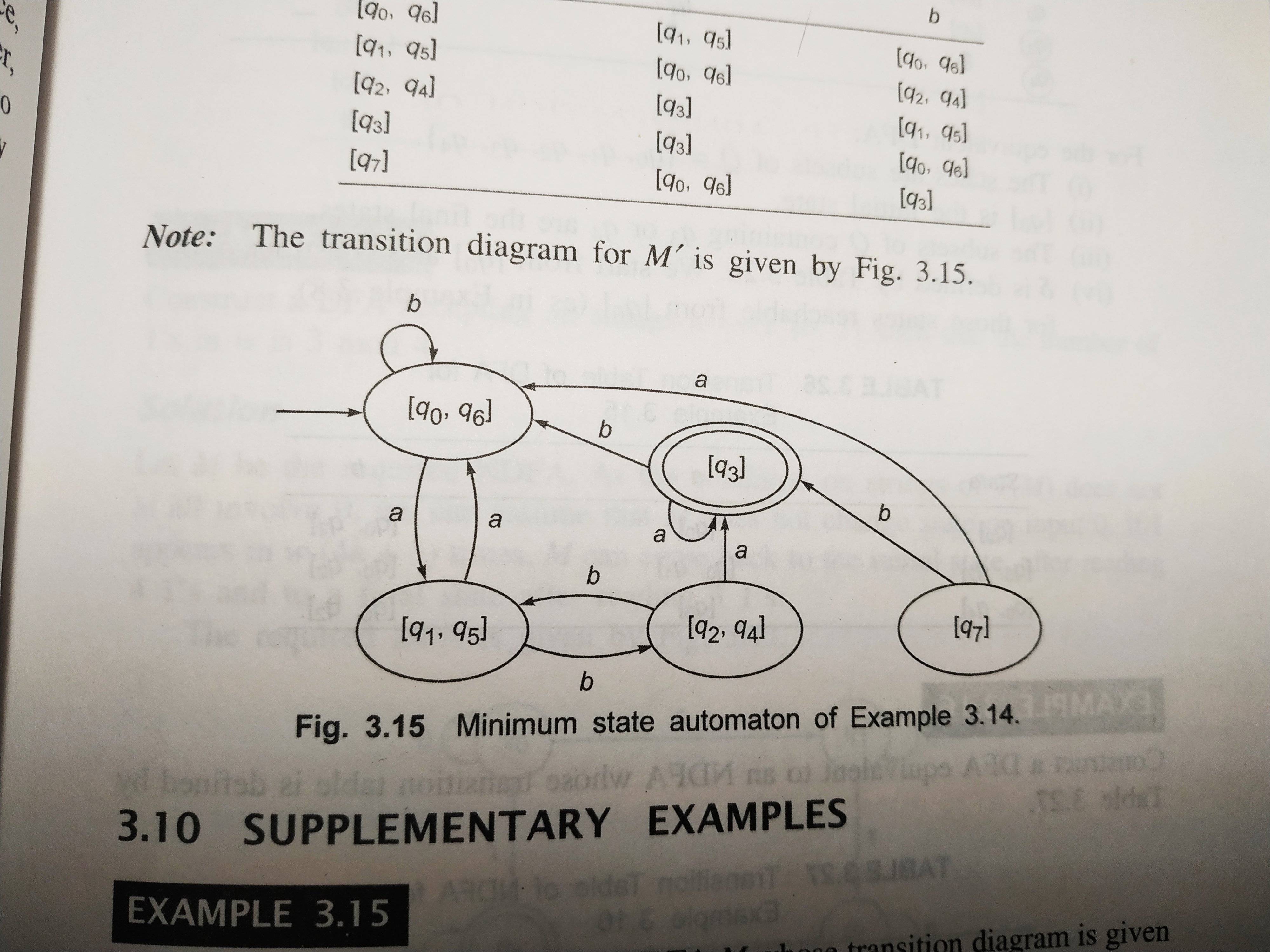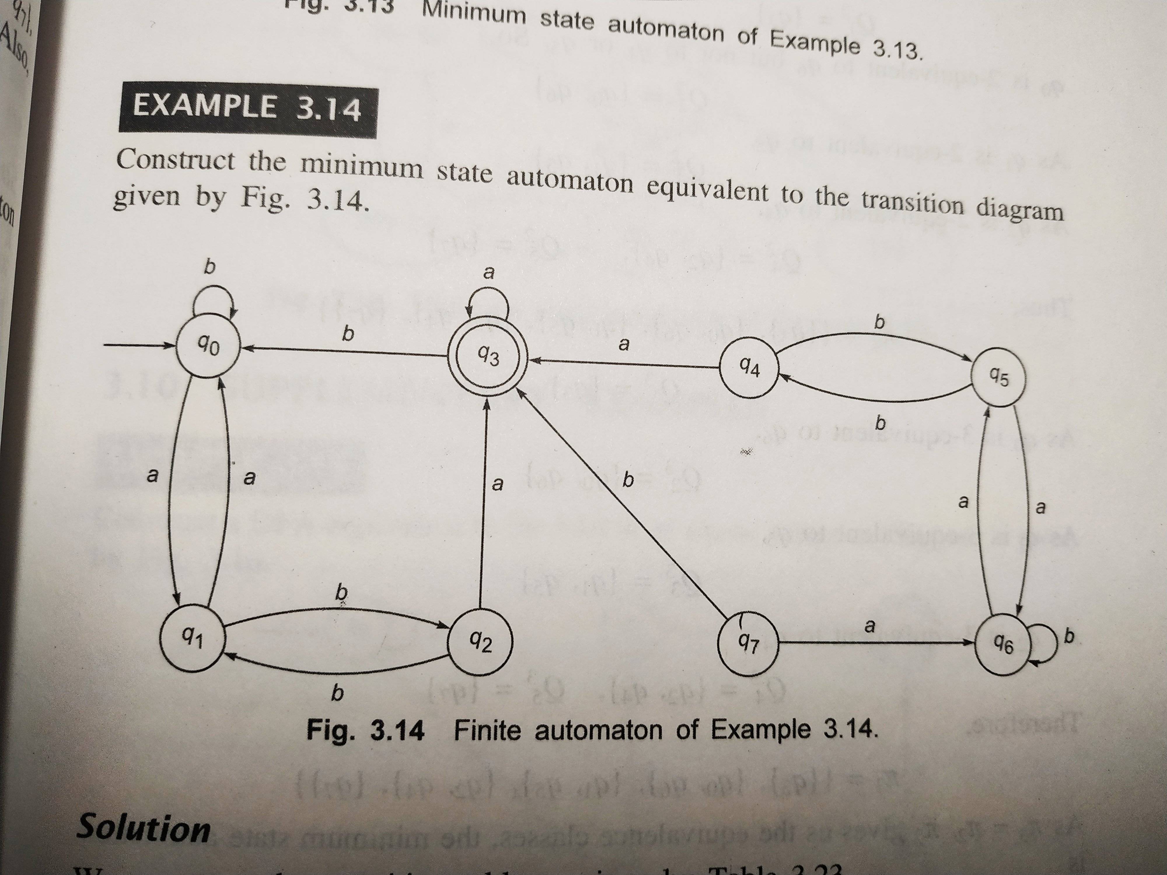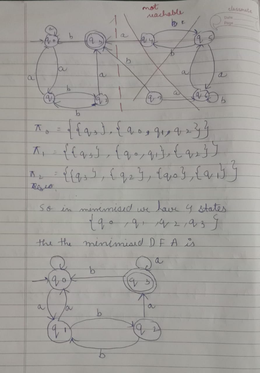 如果仔细观察,所有的状态( q4、q5、q6、q7 )都无法从初始状态q0 (而不仅仅是q7 )到达,因此应该删除所有这4种状态。我的解决方案将从q0、q1、q2、q3开始,然后遵循还原过程。