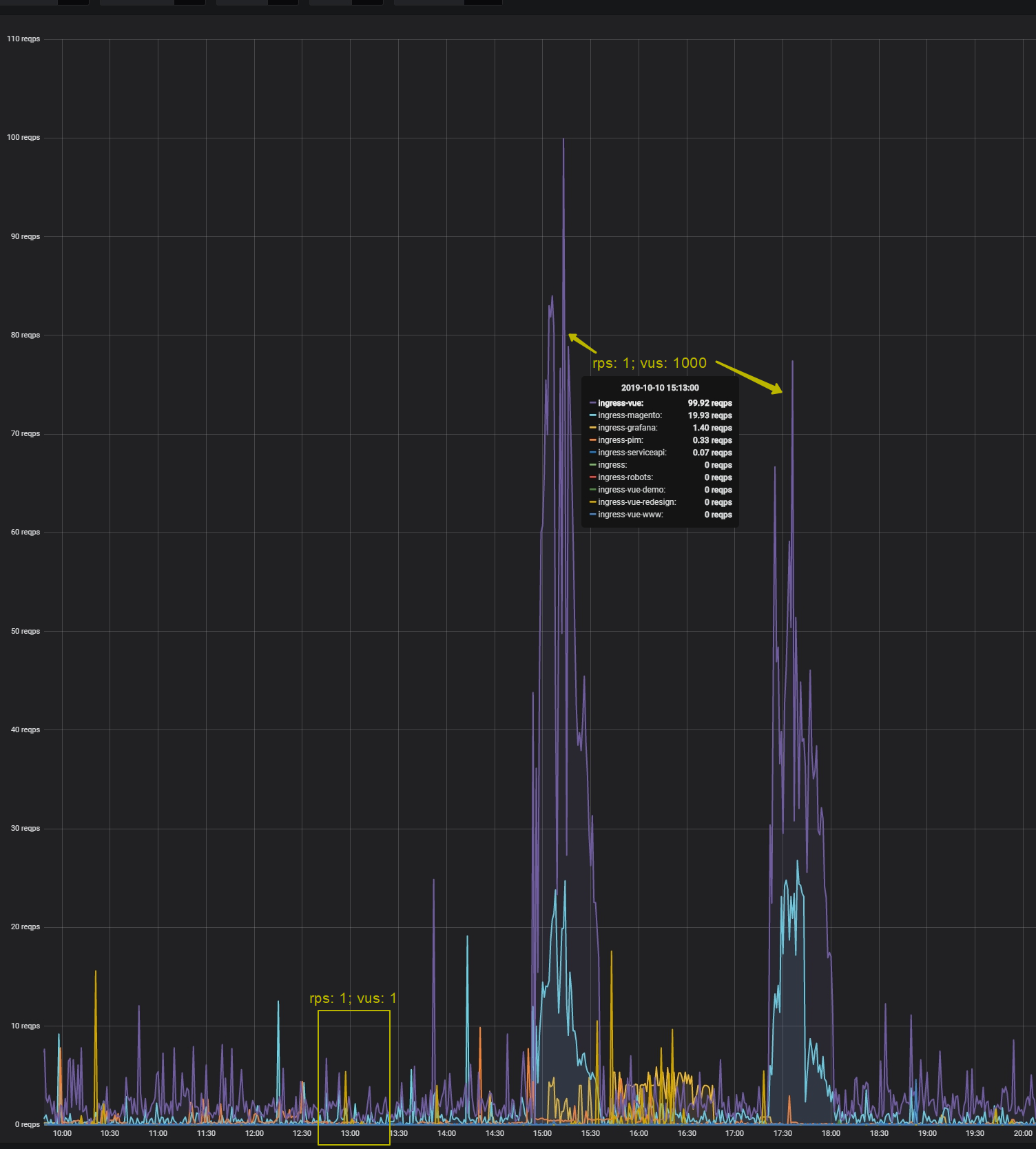 1) rps:1;vus:1;持续时间为N分钟--我在Grafana中看到,请求数量的增加实际上是最小的:+~1 rps。一切都很好;