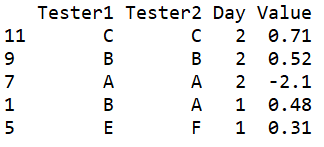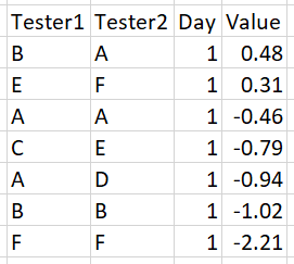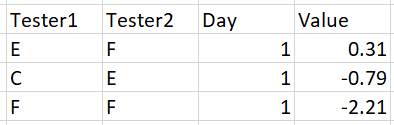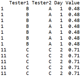 Day == 1ValueTester对,并将其附加到列表中,并保存以备将来使用(注意,测试人员对可以是相同的,也可以是不同的。例如,Tester A和Tester B或Tester A和Tester A.重复步骤c),d)直到完成某一天的所有观察为止。重复,直到数据集中的所有日子都完成为止。