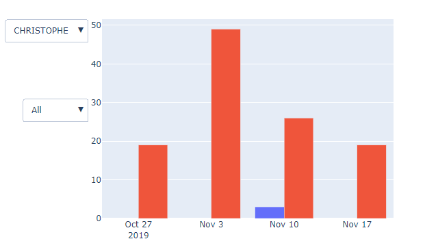 我希望有一个简单的条形图,显示每个日期、每个“原因”分配任务的数量以及一个下拉菜单,其中我可以选择'name‘col中的名称。