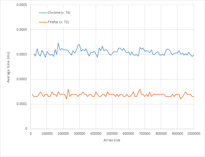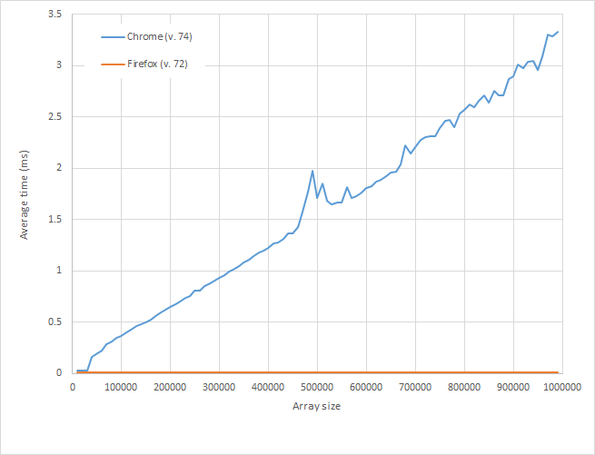 }这是我来自Google Chrome (版本74)和Firefox (版本72)的结果;在Chrome上,性能很明显是O(n),在Firefox上,很明显是O(1),在我的机器上的时间相当一致,大约是0.01ms。